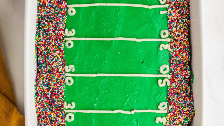 You can stop searching as you have found the best Football Stadium cake recipe. It is an easy to make simple cake base and vibrant creamy frosting – and is a stunning dessert loved by all.